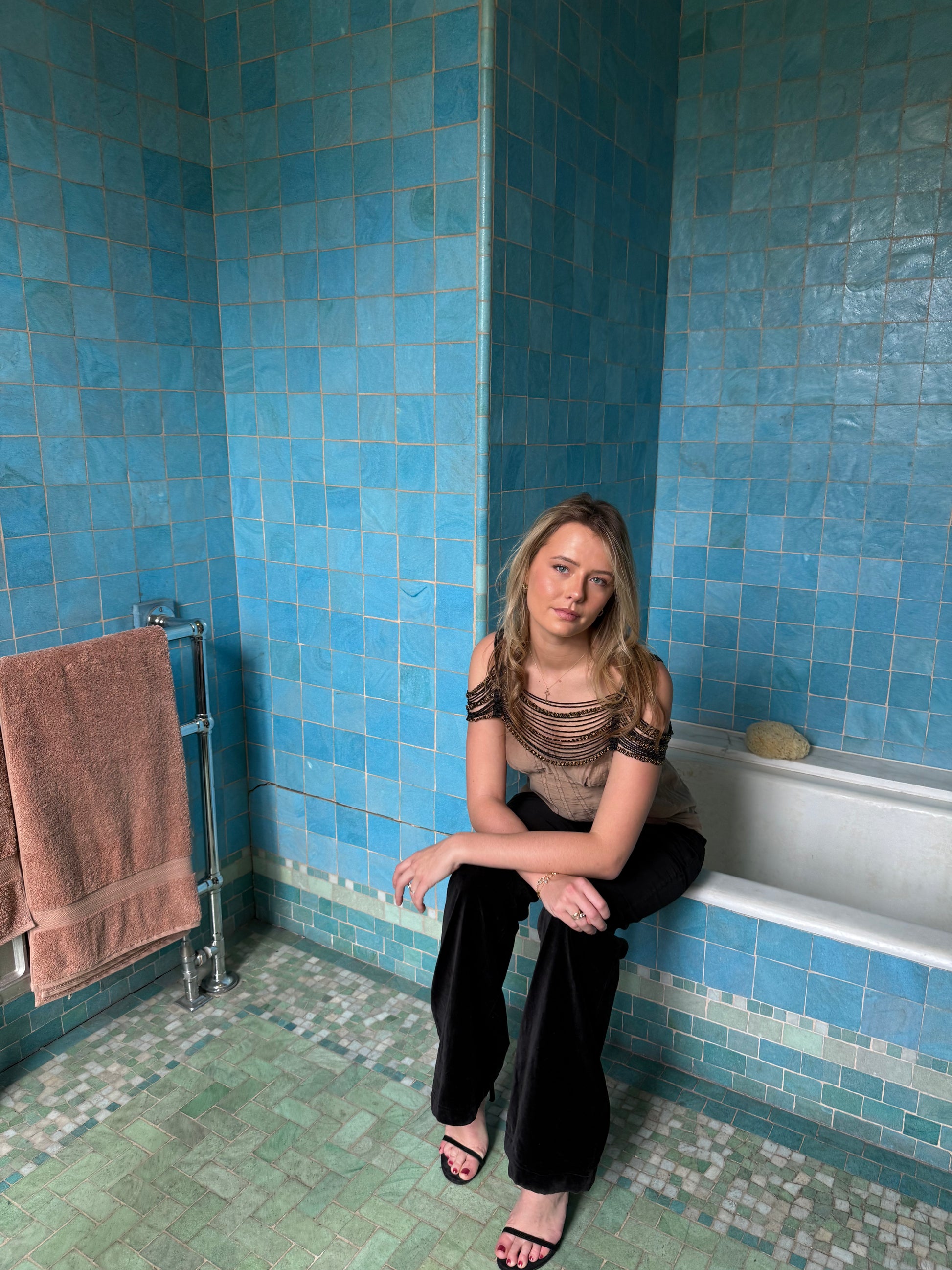 The upgraded Celia Shawl features delicate black beads handwoven into cascading strands, now enhanced with a daisy chain detail. Lightweight and draped, it sits elegantly on the shoulders, adding subtle shimmer and refined texture to any outfit.